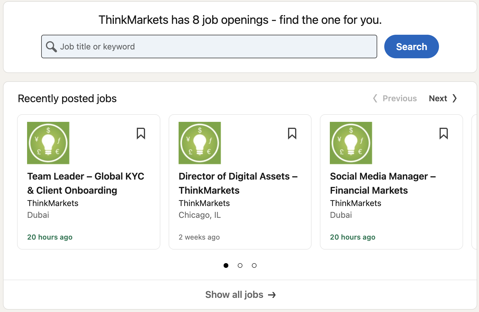 - Check the ThinkMarkets LinkedIn page and the Jobs tab