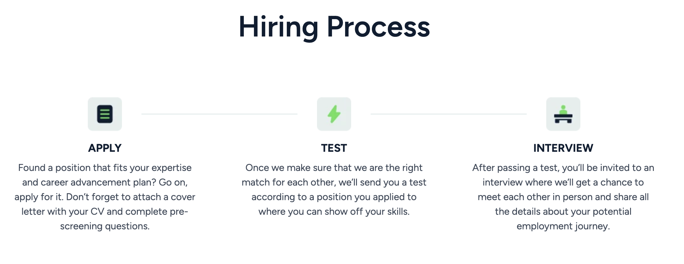 The hiring process is presented as a straightforward three-step flow: Apply (submit your CV, include a cover letter, and complete pre-screening questions), Test (receive a role-specific task once there is mutual fit), and Interview (an in-person meeting after successfully passing the test to discuss the role and employment journey in detail).