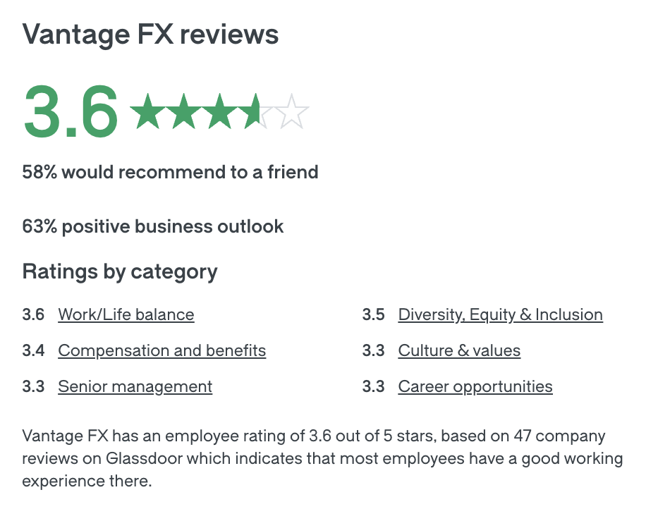 On Glassdoor, Vantage FX/Vantage shows a mixed but readable profile. Overall scores land mid‑to‑upper 3s in many locations and time periods, with reviews that split between “supportive team, few politics, good place to learn” and “uneven management standards, communication gaps” depending on office and manager. You’ll see themes like these in the AU forum sites as well, but Glassdoor is the best single snapshot.